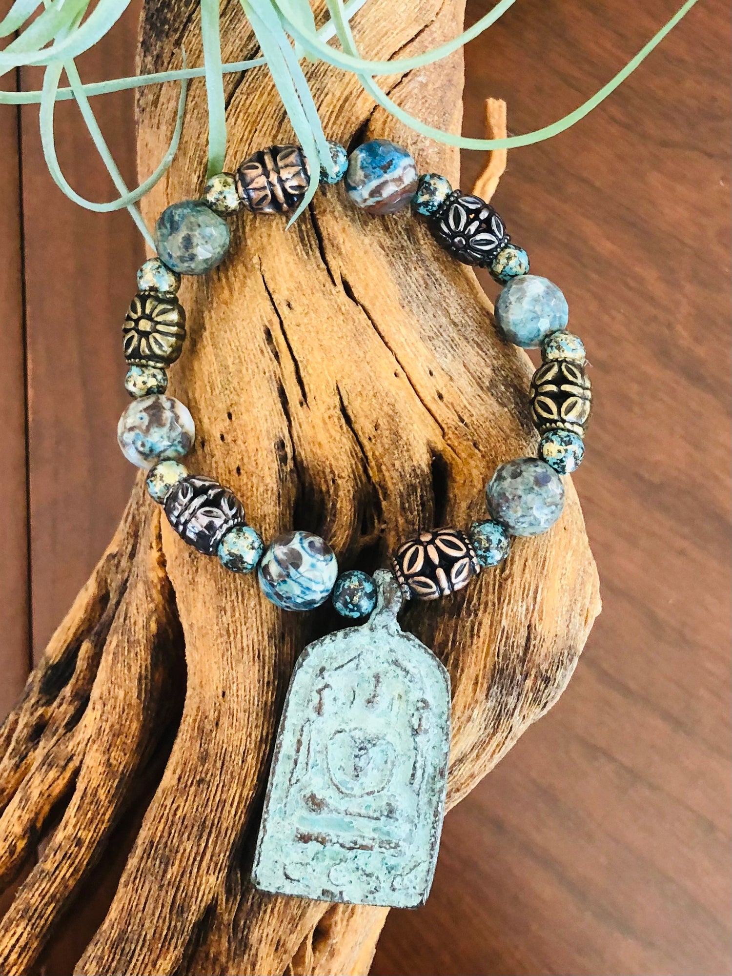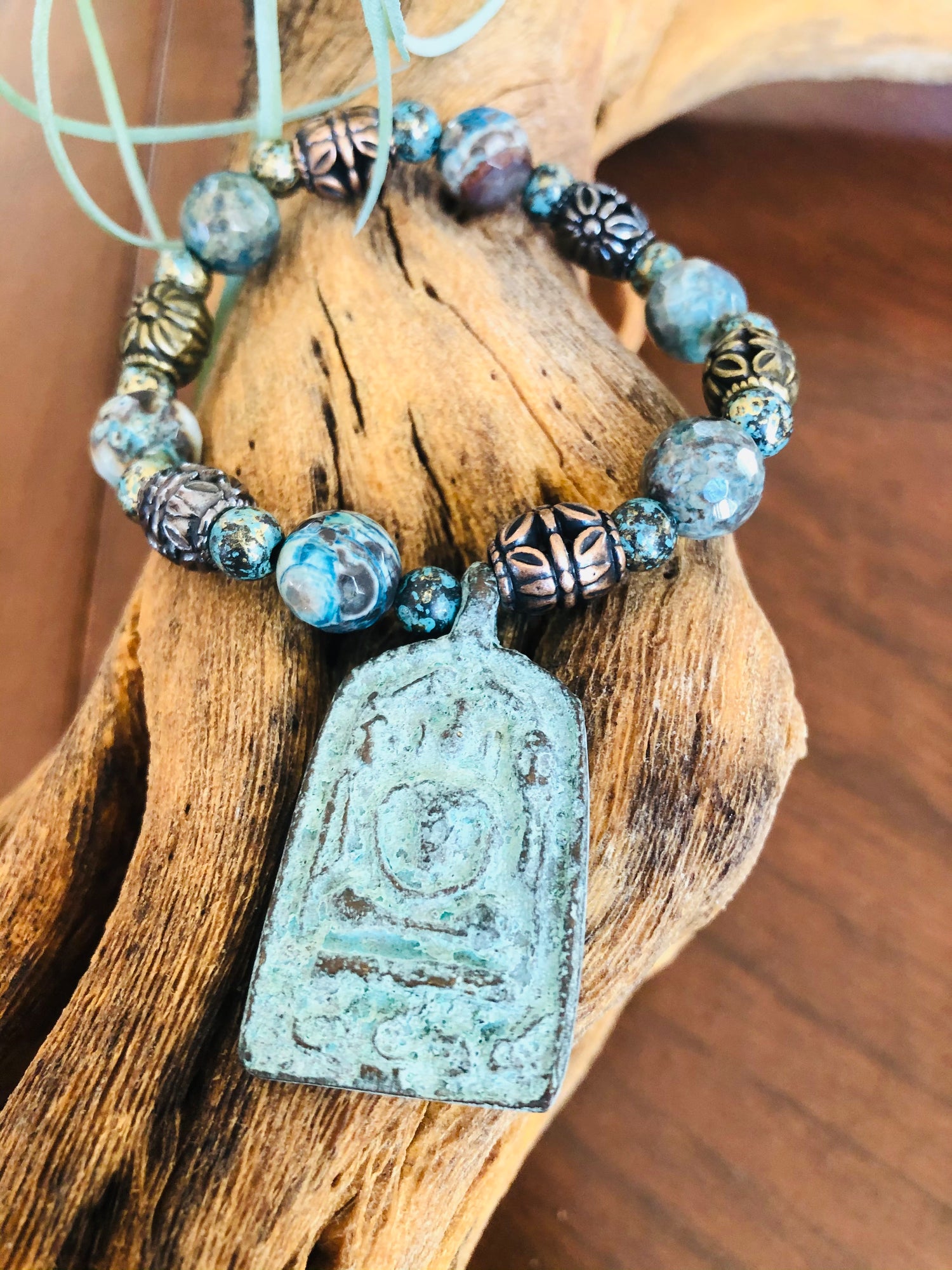 This one of a kind piece is handcrafted with brown and turquois beads, with antique silver, copper and gold spacers. It includes a unique Thai amulet medallion.