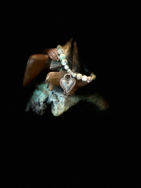 This beautiful handcrafted bracelet enriched with stones of green shades and silver accents, charmed with a silver heart charm.