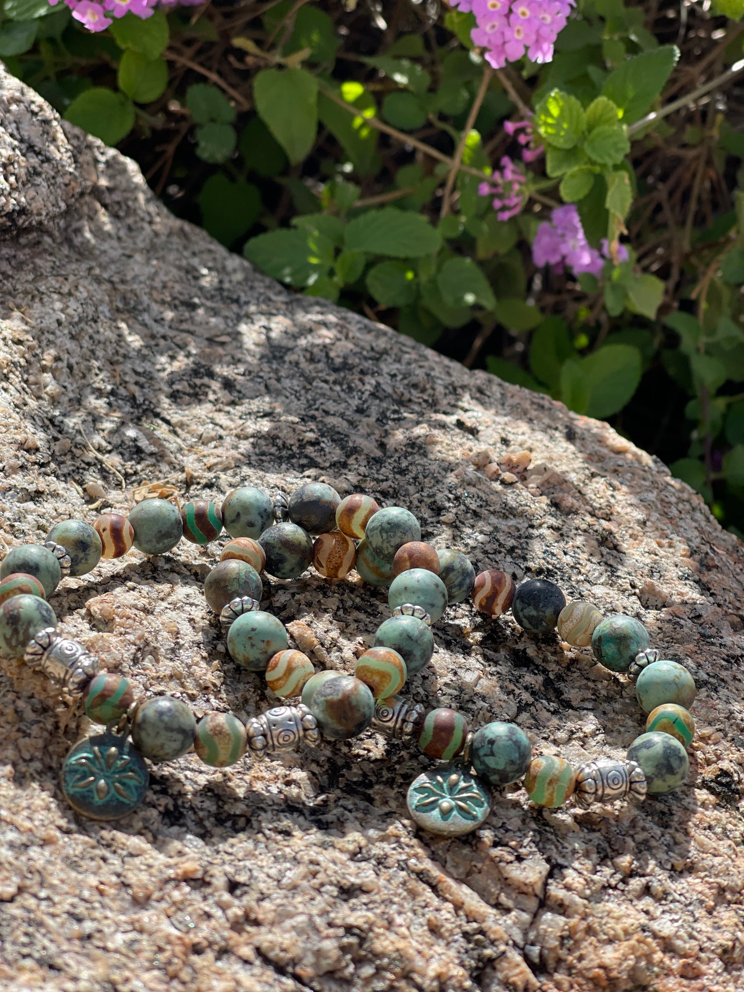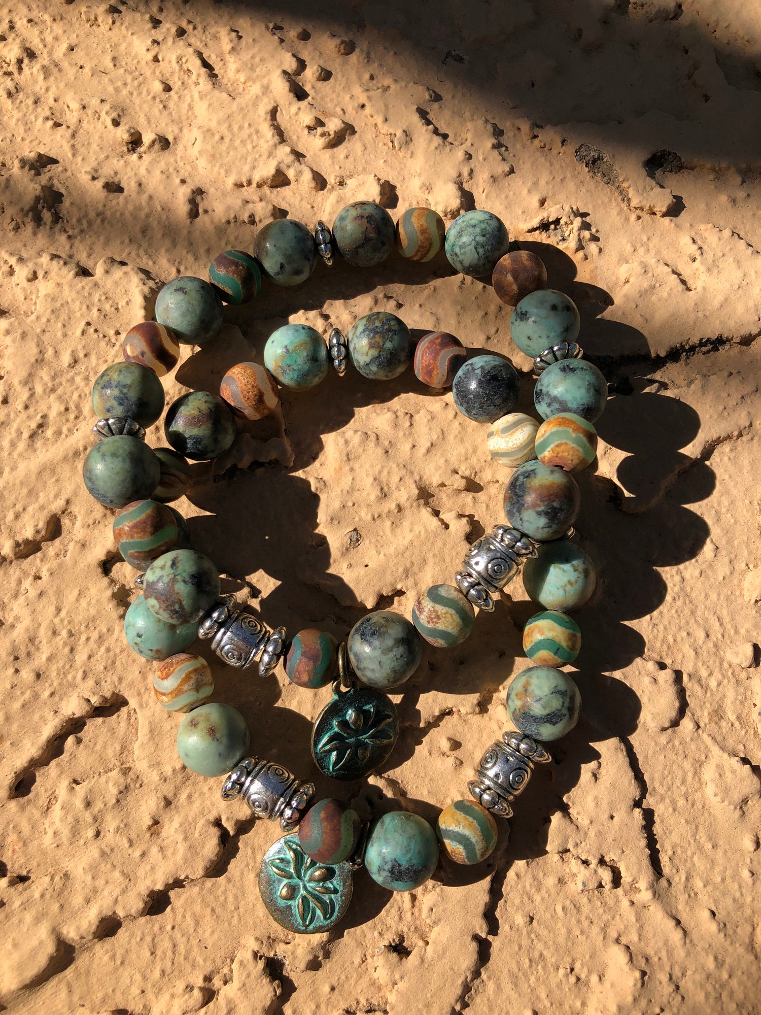 These beautiful bracelets have earth tones of a tropical paradise,silver embellishments and a verde lotus charm the “Hawaii” Purchase as Single strands.